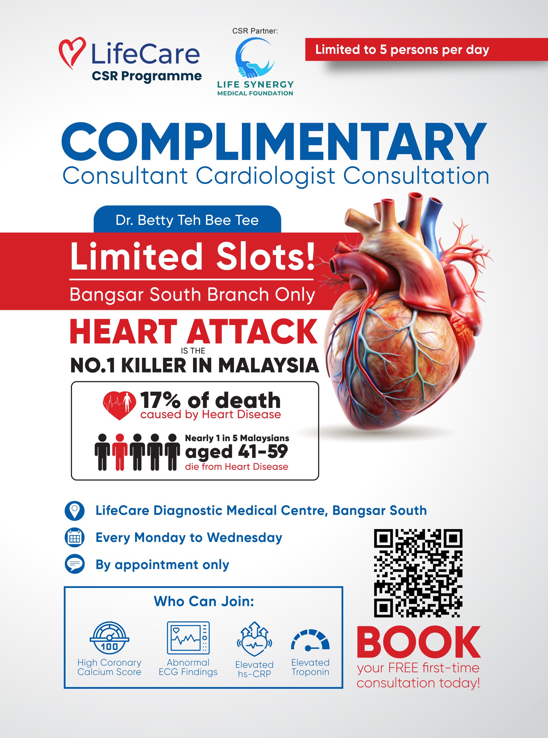 The consultation is available only on Monday to Wednesday, 9:30 AM – 2:30 PM at LifeCare Diagnostic Medical Centre, Bangsar South.